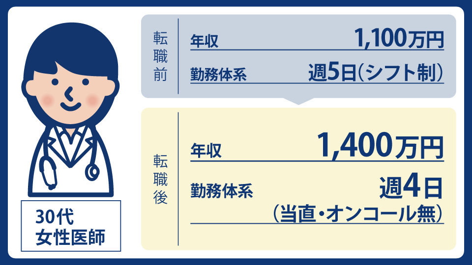 また、Wクリニックは、週4日・日勤のみで、当直もオンコールもなし。さらに年収は1400万円の見通しでした。